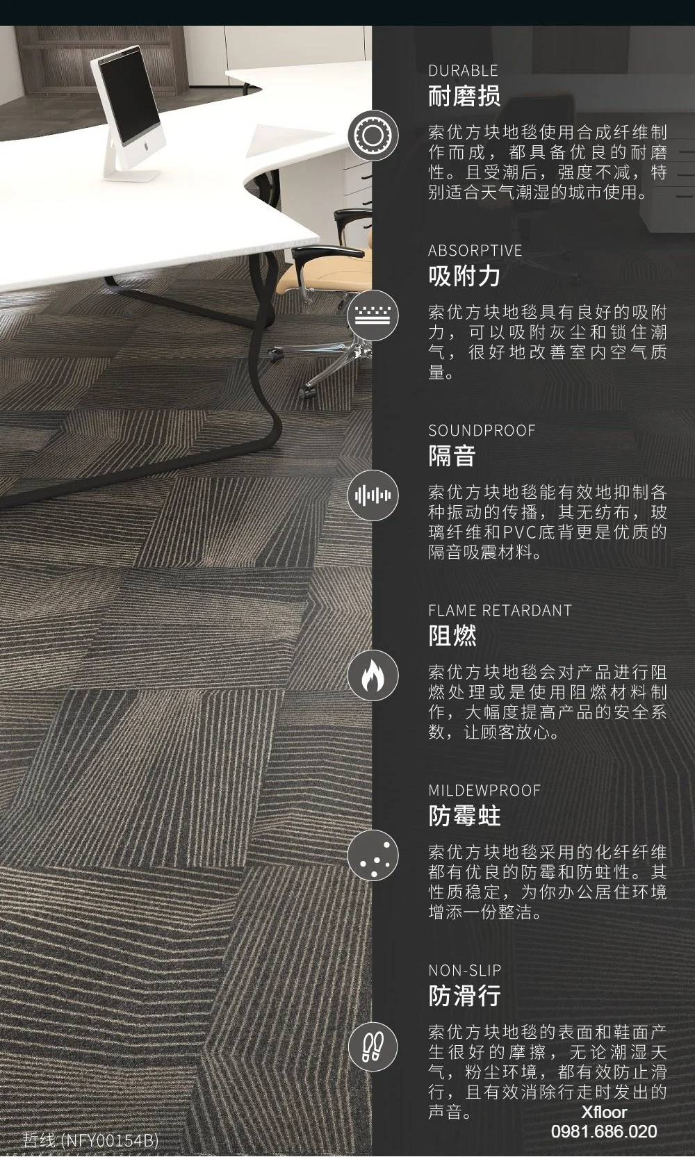 Thảm trải sàn NFY001 carpet flooring là một trong những design đặc sắc. Đây là dòng thảm đẹp, sang trọng, chất lượng. Design thảm hiện đại, chất liệu sợi nylon chống cháy lan, chứng nhận xanh, thân thiện môi trường, phát thải VOC thấp. Thảm lót sàn NFY001 phù hợp lót sàn: